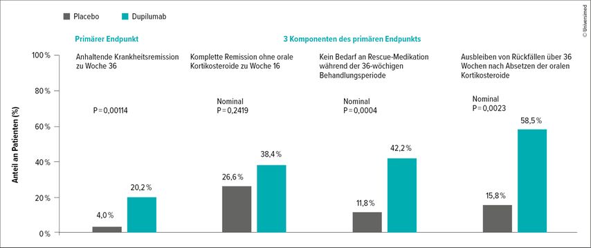 Abb. 1: Signifikant mehr Patienten erreichten unter Dupilumab eine anhaltende Remission als unter Placebo (modifiziert nach Caux F et al. 2025)3