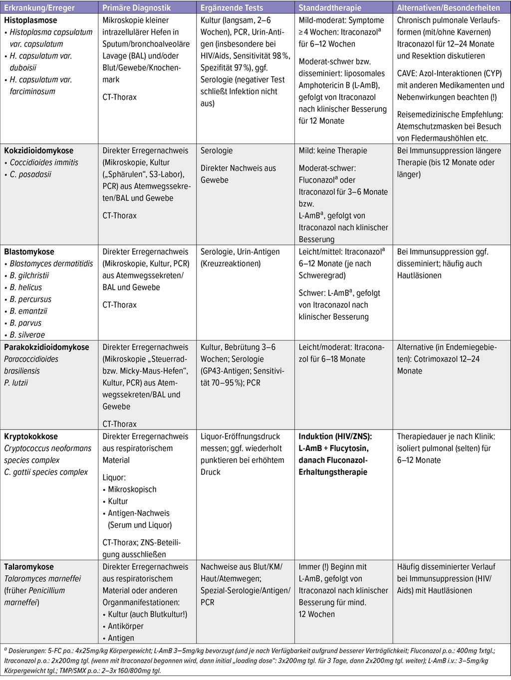 Tab. 1: Übersicht über Diagnostik und Therapie endemischer systemischer Mykosen, die pulmonale Symptome hervorrufen können