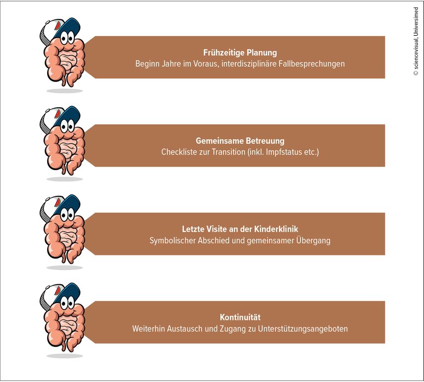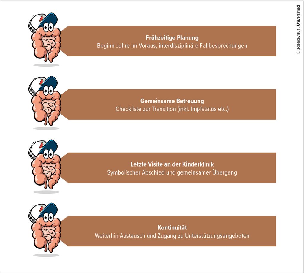 Am Universitätsklinikum Salzburg wurde ein strukturiertes Transitions-Modell etabliert (Abb.1). Bereits Jahre vor der geplanten Übergabe werden komplexe Fälle interdisziplinär im CED-Board besprochen. Der eigentliche Transitions-Termin beinhaltet ein gemeinsames Gespräch an der Kinderklinik mit anschließendem symbolischem „Übergangsspaziergang“ zur 1.Medizinischen Abteilung. Der Kontakt zur Pädiatrie bleibt über die CED-Ambulanz erhalten; das multiprofessionelle Team begleitet weiter. Mit dem Patientenabend „Mit Schirm, Darm und Melone“ mit dem Maskottchen Tino (Instagram: @schirmdarmundmelone) wurde zudem ein Format geschaffen, das Gesundheitskompetenz und Peer-Austausch junger Patient:innen stärkt.