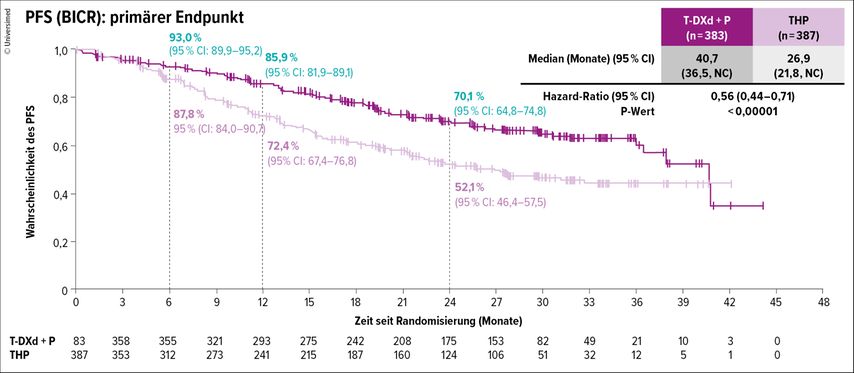 Die Daten der CLEOPATRA-Studie bildeten über mehr als eine Dekade den Therapiestandard beim HER2-positiven Mammakarzinom. Auf dem SABCS 2024 wurden nun Ergebnisse vorgestellt, die zeigen, wie sich die Erhaltungstherapie weiter verbessern lässt. Die PATINA-Studie untersuchte den Einsatz von Palbociclib in der Erhaltungstherapie des metastasierten, triple-positiven Mammakarzinoms. Eingeschlossen wurden ausschließlich Patientinnen, die auf die Induktionstherapie angesprochen hatten, sodass eine Population mit insgesamt günstigem Risikoprofil betrachtet wurde. Durch die Zugabe von Palbociclib konnte eine klinisch relevante Verlängerung des medianen PFS erzielt werden – von 29,1 auf 44,3 Monate, entsprechend einem Zugewinn von 15,2 Monaten – bei gleichzeitig guter Verträglichkeit.9 Zudem war das HER2+ Mammakarzinom der erste solide Tumor, bei dem Antikörper-Wirkstoff-Konjugate (ADCs) zugelassen wurden. Auf Grundlage der EMILIA-Studie etablierte sich zunächst Trastuzumab-Emtansin (T-DM1) in der Zweitlinientherapie.10 Dieser Standard änderte sich jedoch auf Basis der Daten der DESTINY-Breast03-Studie: Darin erwies sich Trastuzumab-Deruxtecan (T-DXd) gegenüber T-DM1 als deutlich überlegen. Unter T-DXd betrug das PFS 28,8 Monate im Vergleich zu 6,8 Monaten unter T-DM1; auch das Gesamtüberleben (OS) war signifikant verlängert.11 Darüber hinaus belegen die TUXEDO-1- und DESTINY-Breast12-Studien die hohe intrakranielle Wirksamkeit von T-DXd mit relevanten Ansprechraten bei Patientinnen mit zerebraler Metastasierung.12,13 Aus der DESTINY-Breast09-Studie liegen nun erste Daten zum Einsatz von T-DXd in der Erstlinientherapie des metastasierten HER2-positiven Mammakarzinoms vor. DESTINY-Breast09 war eine dreiarmige Studie, in der T-DXd als Monotherapie, T-DXd in Kombination mit Pertuzumab (T-DXd-P) sowie der bisherige Standard aus Trastuzumab, Pertuzumab und Docetaxel (THP) miteinander verglichen wurden. Auf dem ASCO 2025 wurden Ergebnisse der beiden Arme T-DXd-P und THP vorgestellt; Daten aus dem dritten Studienarm stehen bislang noch aus. Unter der Kombination T-DXd-P wurde ein medianes PFS von 40,7 Monaten erreicht, verglichen mit 26,9 Monaten im Kontrollarm (Abb. 1). Darüber hinaus zeigten sich eine höhere objektive Ansprechrate (85,1% vs. 78,6%) sowie ein größerer Anteil radiologischer Komplettremissionen (15,1% vs. 8,5%). Während im Kontrollarm die Chemotherapie nach sechs bis acht Zyklen beendet wurde, erfolgte die Gabe von T-DXd bis zum Progress oder bis zum Auftreten einer Unverträglichkeit. Zudem erhielt nur ein geringer Anteil der mit THP behandelten Patientinnen in der Zweitlinie T-DXd, entgegen dem aktuellen klinischen Standard. Hinsichtlich der Toxizität zeigte sich eine vergleichbare Rate an T-DXd-assoziierter ILD/Pneumonitis wie in anderen Studien zu T-DXd (12%); es traten zwei ILD-bedingte Todesfälle auf. Gastrointestinale Nebenwirkungen, insbesondere Übelkeit und Diarrhö, waren unter T-DXd-P häufiger als unter THP, wohingegen Polyneuropathien seltener beobachtet wurden.14 Eine auf dem ESMO 2025 vorgestellte Subgruppenanalyse zeigte einen Vorteil für T-DXd-P – unabhängig davon, ob die Erkrankung primär metastasiert war, sowie unabhängig vom PIK3CA-Mutationsstatus oder Hormonrezeptor-Status. Es bleibt offen, wie die Substanz in der klinischen Routine in der Erstlinientherapie zum Einsatz kommen wird – ob bis zur „best response“, mit Umstellung auf eine Erhaltungstherapie nach sechs bis acht Zyklen, in kontinuierlicher Gabe bis zum Progress oder nur bei Hochrisikopatientinnen. Die Effektivität eines Konzepts mit Induktionstherapie durch T-DXd über sechs Zyklen, gefolgt von einer Erhaltungstherapie mit Trastuzumab und Pertuzumab, wird derzeit beispielsweise in der DEMETHER-Studie untersucht.15