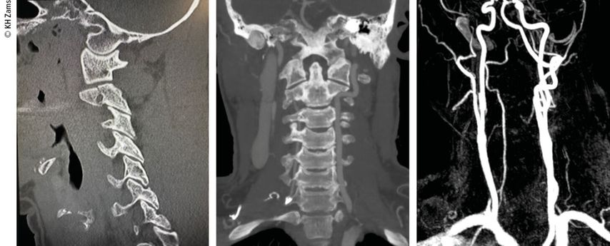 Abb. 3: Mann, 30a, Z.n. Snowboardsturz, Rotations-/Subluxationsverletzung C5/6 mit Dissektion der A. vertebralis r.; Zervikobrachialgie mit sensiblem Defizit; OP unter Heparintherapie, APT für 3 Monate
