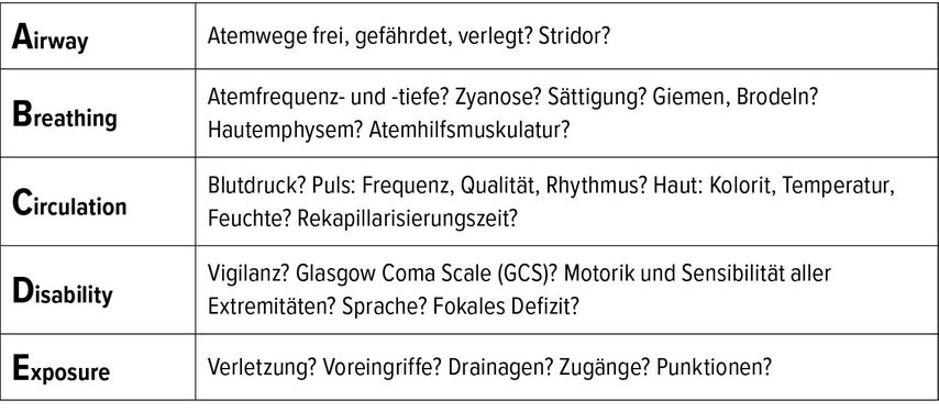 Nach dem ABCDE-Schema vorgehen: Airway, Breathing, Circulation, Disability, Exposure.
