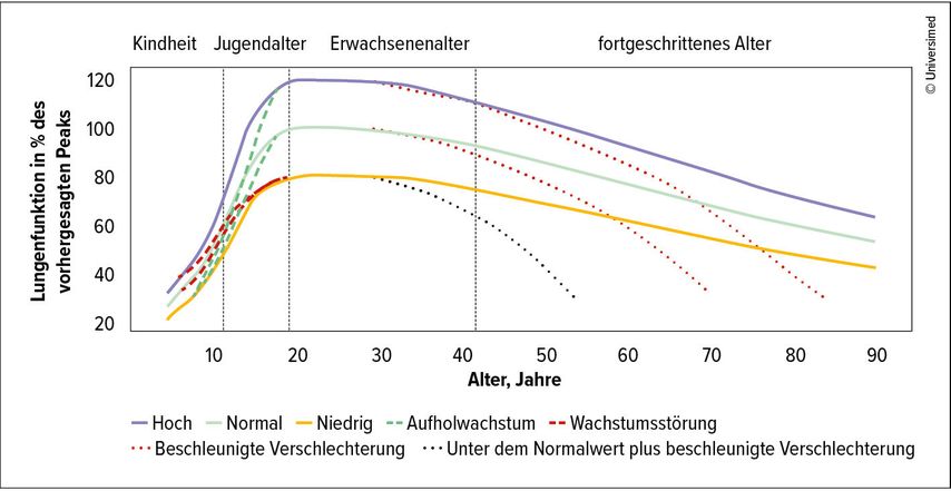 Da die meisten dieser Strategien auf die Erkennung von Patient:innen erst nach Entstehung von funktionellen und radiologischen Einschränkungen zielen, stellt sich zunehmend die Frage, ob Personen mit höherem Risiko bereits früher identifiziert werden können. Dazu hat sich in den letzten Jahren das Konzept von „lung function trajectories“ etabliert. Dieses umfasst die Überlegung, dass während des Lungenwachstums und der schließlich erreichten maximalen Lungenfunktion bereits der Grundstein zur zukünftigen Krankheitsentwicklung gelegt wird. Da die Lungenfunktion über die Lebensspanne natürlicherweise langsam abnimmt, haben Individuen, die bereits im jungen Erwachsenenalter kein optimales Lungenwachstum erreicht haben, ein höheres Risiko, im Verlauf nach Einwirken von verschiedenen Noxen eine Lungenerkrankung zu entwickeln.12 Somit kann die Krankheitsentstehung einerseits durch einen raschen Abfall der Lungenfunktion durch schädliche Noxen wie Nikotinkonsum, aber auch durch eine niedrige Ausgangsfunktion bedingt sein. Im Gegensatz dazu können Individuen mit sehr guter Lungenfunktion mehr schädliche Einflüsse kompensieren. Eine genaue longitudinale Beurteilung setzt damit aber eine regelmäßige Messung der Lungenfunktion voraus, um einen Abfall über der Norm rechtzeitig zu erkennen (Abb.2).13 Dazu wurde auch ein „lung function tracker“ der Global Lung Function Initiative vorgestellt, mit dem das Monitoring der Lungenfunktion, ähnlich dem von Wachstumsperzentilen, über eine längere Zeitspanne möglich ist.14 Um Werkzeuge wie dieses effektiv verwenden zu können, sollte somit bereits im Kindesalter regelmäßig die Lungenfunktion mittels Spirometrie bestimmt werden. Dieser Ansatz wird durch das „Healthy Lungs for Life for Schools“-Projekt der European Lung Foundation unterstützt, um neben validen Messungen auch Aufklärung zur Lungengesundheit zu betreiben. Auch bereits in Österreich wurden dafür in Wien über die LEAD-Studie mittels mobiler Spirometrie Schulkinder zwischen 7 und 14 Jahren untersucht.15