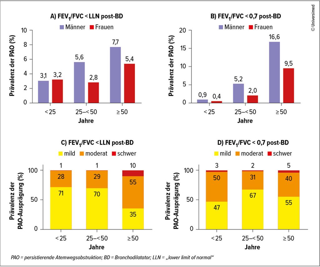 Zur Prävalenz der COPD in Österreich gibt es nur wenige Daten. Eine Untersuchung im Rahmen der BOLD(Burden of Obstructive Lung Disease)-Studie in Salzburg ergab im Jahr 2007 bei 1200 untersuchten Probanden >40 Jahre eine Prävalenz von fast 11% mit einer FEV1/FVC-Ratio <0,7 und einem FEV1 <80%.1 Von diesen Teilnehmer:innen hatten aber nur 50% auch tatsächlich eine bekannte COPD-Diagnose. Limitierend muss hier die Verwendung der fixierten Ratio erwähnt werden, die besonders im höheren Alter zur Überdetektion von obstruktiven Funktionsmustern führen kann.2