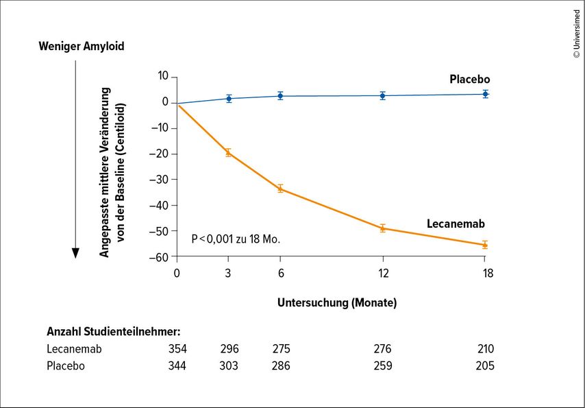 Mit Lecanemab und Donanemab kamen im April und September 2025 zwei neue Antikörpertherapien auf den Markt, die das Alzheimertherapiefeld nachhaltig verbessern können. Donanemab führt zu einer signifikanten Reduktion von Amyloidplaques und Lecanemab kann Protofibrillen und Amyloidplaques deutlich, bis unter die Nachweisgrenze, reduzieren.43 Beide Therapien sind für die leichte kognitive Störung (MCI) und die milde Alzheimerdemenz mit einem positiven Amyloidnachweis indiziert.44,45 Jedoch sind die Therapien mit einem gewissen Aufwand verbunden, da eine Verabreichung alle 2 oder 4 Wochen erfolgen sollte. Hinzu kommen eine sorgfältige Biomarkerdiagnostik und 4 MR-Termine in den ersten 6 Monaten. Da es für die Therapien eine Vielzahl an Kontraindikationen gibt, kommen in der klinischen Routine nur 10% der Patient:innen dafür infrage. Bei diesen Patient:innen kann eine Verringerung der Raten an klinischer Demenz (CDR) erzielt werden, jedoch tritt auch hier eine deutliche, aber verzögerte und langsamere Alzheimerprogression auf. Ein Durchbruch im Therapiefeld wurde hingegen auf neurobiologischer Ebene mit einer signifikanten Reduktion von β-Amyloid gezeigt (Abb 1).46