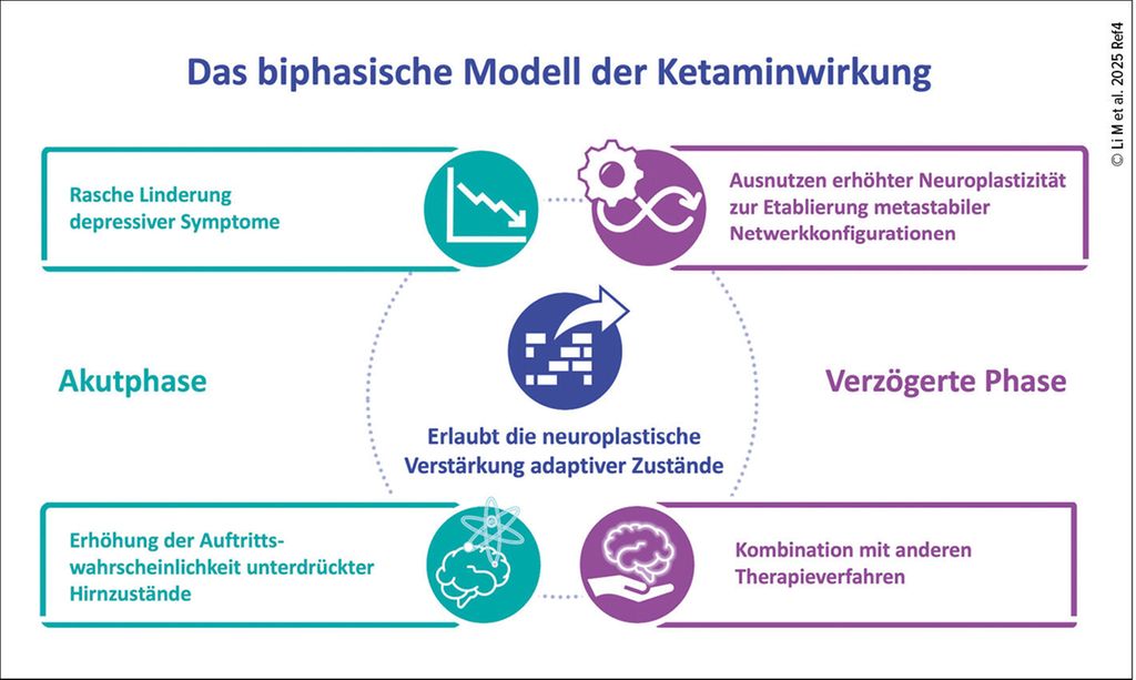 Das schnell wirksame Antidepressivum (S-)Ketamin wird bei therapieresistenten Patient:innen effektiv eingesetzt. Als zentrale Komponente eines biphasischen Wirkmechanismus wird für subanästhetische Dosen ein Neuroplastizitätsfenster vermutet, das psychotherapeutisch genutzt werden sollte, um rasche Symptomlinderung in anhaltende Response zu überführen.