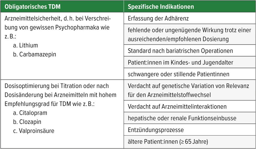 Gestützt auf die aktuelle Konsensus- Leitlinie für das therapeutische Drug-Monitoring in der Neuropsychopharmakologie lässt sich zwischen einem obligatorischen TDM und spezifischen Indikationen für die Anwendung von TDM unterscheiden.4 TDM gilt in der Behandlung mit einer kleinen Gruppe von Psychopharmaka wie z.B. Lithium oder Carbamazepin als obligatorisch, dabei handelt es sich um Medikamente mit einem engen therapeutischen Referenzbereich. Ebenfalls gilt TDM als obligatorisch für eine Dosisoptimierung während der Titration oder nach Dosisänderung bei Arzneimitteln mit robuster Evidenzlage bzgl. der Sinnhaftigkeit von TDM bzw. solchen mit hohem TDM-Empfehlungsgrad. Bei spezifischen Indikationen kann eine Reihe von klinischen Fragestellungen mittels TDM-Anwendung beantwortet werden, wie z. B. eine Rückfallprävention aufgrund unsicherer Medikamenteneinnahme oder Optimierung der Psychopharmakotherapie bei schwangeren oder stillenden Patientinnen. Tabelle 1 gibt einen Überblick über die möglichen Fragestellungen.