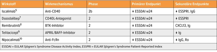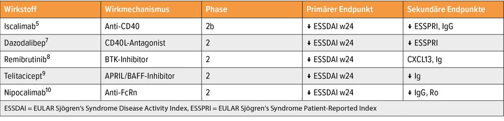 1 Tarn JR et al.: Symptom-based stratification of patients with primary Sjögren’s syndrome: multi-dimensional characterisation of international observational cohorts and reanalyses of randomised clinical trials. Lancet Rheumatol 2019; 1(2): e85-94 2 Berry JS et al.: Examining the biological pathways underlying clinical heterogeneity in Sjogren’s syndrome: proteomic and network analysis. Ann Rheum Dis 2024; 83(1): 88-95 3 Lackner A et al.: Patients’ recollection about the onset of Sjögren’s disease - a mixed methods study on the patients’ perspective. Arthritis Res Ther 2024; 26(1): 169 4 Pontarini E et al.: Serum and tissue biomarkers associated with composite of relevant endpoints for Sjögren’s syndrome (CRESS) and Sjögren’s tool for assessing response (STAR) to B cell-targeted therapy in the trial of anti-B cell therapy in patients with primary Sjögren’s syndrome (TRACTISS). Arthritis Rheumatol 2024; 76(5): 763-76 5 Fisher BA et al.: Safety and efficacy of subcutaneous iscalimab (CFZ533) in two distinct populations of patients with Sjögren’s disease (TWINSS): week 24 results of a randomised, double-blind, placebo-controlled, phase 2b dose-ranging study. Lancet 2024; 404(10452): 540-53 6 Ramos-Casals M et al.: EULAR recommendations for the management of Sjögren’s syndrome with topical and systemic therapies. Ann Rheum Dis 2020; 79(1): 3-18 7 St Clair EW et al.: CD40 ligand antagonist dazodalibep in Sjögren’s disease: a randomized, double-blinded, placebo-controlled, phase 2 trial. Nat Med 2024; 30(6): 1583-92 8 Dörner T et al.: Efficacy and safety of remibrutinib, a selective potent oral BTK inhibitor, in Sjögren’s syndrome: results from a randomised, double-blind, placebo-controlled phase 2 trial. Ann Rheum Dis 2024; 83(3): 360-71 9 Xu D et al.: Efficacy and safety of telitacicept in primary Sjögren’s syndrome: a randomized, double-blind, placebo-controlled, phase 2 trial. Rheumatology (Oxford) 2024; 63(3): 698-705 10 Gottenberg J et al.: Efficacy and safety of nipocalimab, an anti-FcRn monoclonal antibody, in primary Sjögren’s disease: results from a phase 2, multicentre, randomized, placebo-controlled, double-blind study (DAHLIAS). ACR Convergence 2024; Abstract Nr. 2527; verfügbar unter https://acrabstracts.org/abstract/efficacy-and-safety-of-nipocalimab-an-anti-fcrn-monoclonal-antibody-in-primary-sjogrens-disease-results-from-a-phase-2-multicenter-randomized-placebo-controlled-double-blind-study-dah/ (zuletzt aufgerufen am 13.3.2025)