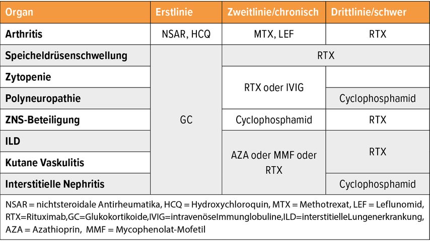 Tab. 1: Therapie der extraglandulären Manifestationen der Sjögren-Erkrankung (adaptiert nach Ramos-Casals et al.)6