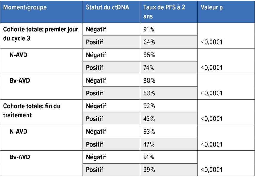 Une analyse plus approfondie des données de l’étude SWOG S1826 a également révélé que la charge mutationnelle tumorale (TMB), déterminée par le ctDNA, était significativement associée à la PFS, à la fois au premier jour du troisième cycle et à la fin du traitement, indépendamment du bras de traitement.11 Les auteur·es de cette analyse estiment que leurs résultats soutiennent l’utilisation potentielle du ctDNA comme biomarqueur intégral dans une étude clinique adaptée à la réponse du ctDNA dans le cHL avancé.