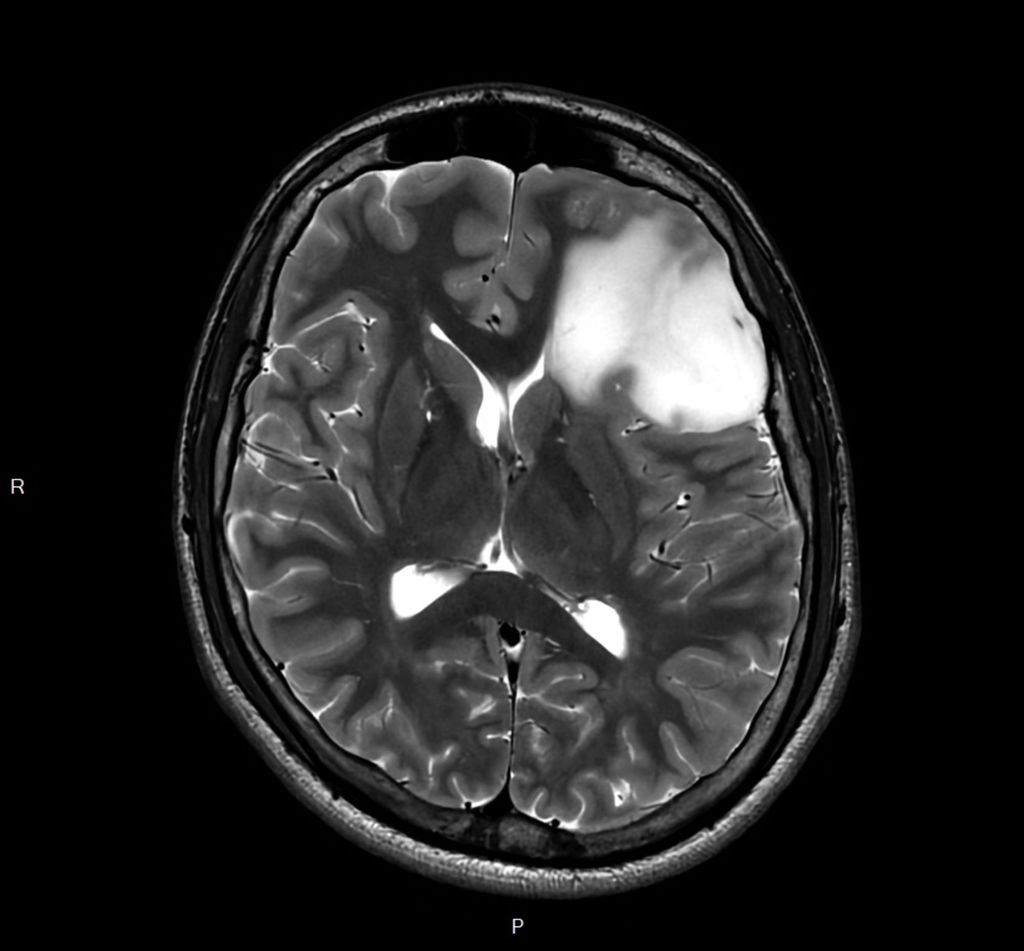 Fig.1: Image IRM d’un astrocytome de grade2 de l’OMS dans le lobe frontal gauche. Séquence T2
