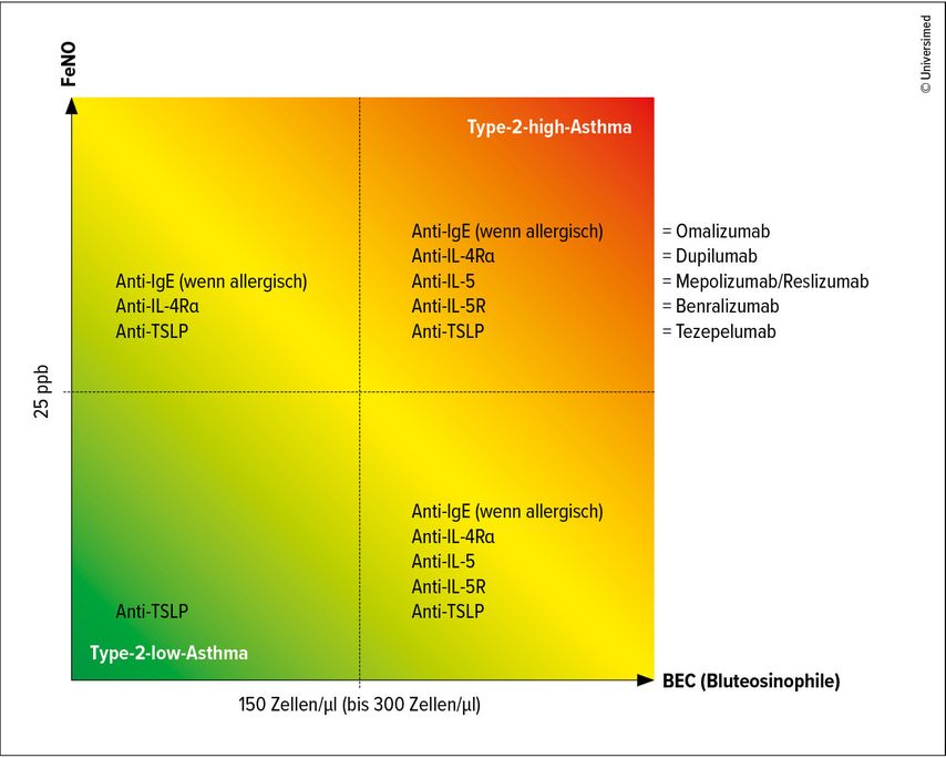 Abb. 1: FeNO und BEC: Prädiktoren für das therapeutische Ansprechen von Biologika bei schwerem unkontrolliertem Asthma (modifiziert nach Brusselle GG, Koppelman GH 2022)1