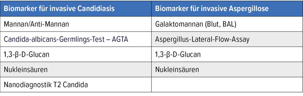 Tab. 2: Biomarkerdiagnostik bei invasiven Pilzinfektionen (modifiziert nach Maertens J et al.1, Pòvoa P et al.3, Lass-Förl C4)