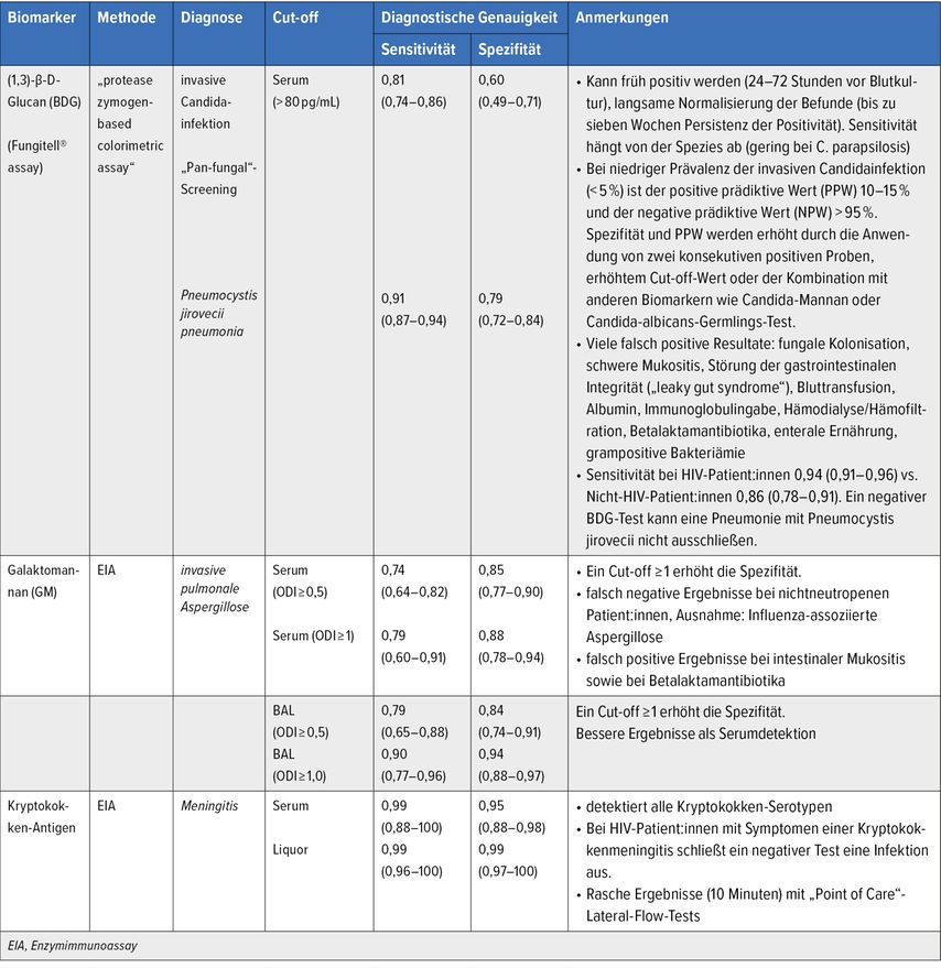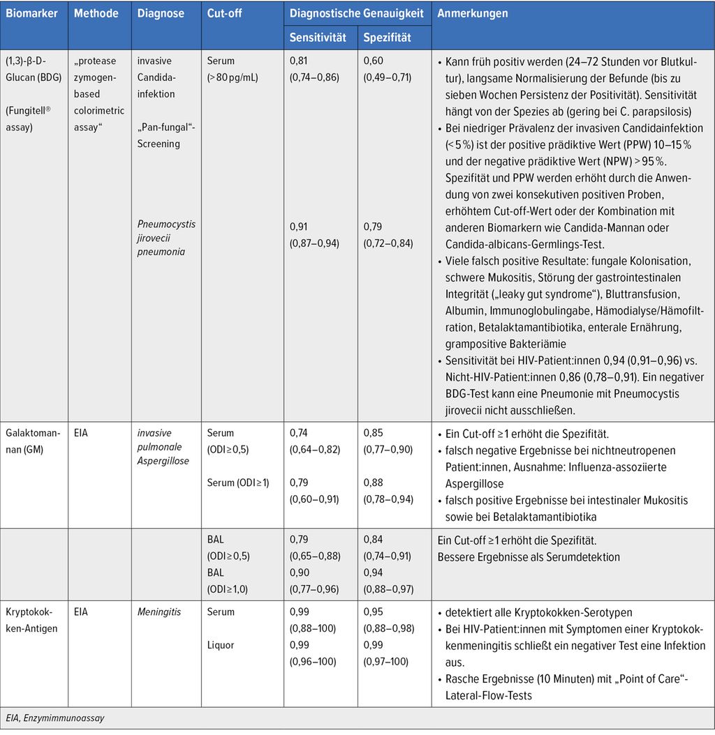 Die Bestimmung verschiedener Biomarker spielt in der Infektionsabklärung invasiver Mykosen eine wichtige Rolle. Die Bewertung eines positiven Biomarkers bei Pilzinfektionen hängt von der klinischen Prätestwahrscheinlichkeit, der Spezifität/Sensitivität des Tests, dem klinischen Bild und der Dynamik der Biomarkerwerte ab. Ein positives Ergebnis sollte immer im Kontext anderer Befunde interpretiert werden, um eine invasive Pilzinfektion sicher zu diagnostizieren oder auszuschließen.