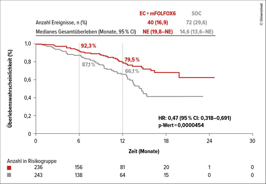 Im Kontrollarm erhielten Patient:innen in der dreiarmigen Studie eine Standardtherapie (SOC) mit mFOLFOX6, FOLFOXIRI oder CAPOX mit oder ohne Bevacizumab. Die primären Endpunkte waren das progressionsfreie Überleben (PFS) und die Rate des objektiven Ansprechens (ORR) laut zentraler, unabhängiger Beurteilung. Beim ASCO GI wurden primäre Ergebnisse für den Vergleich der Studienarme EC+mFOLFOX6 vs. SOC präsentiert.1