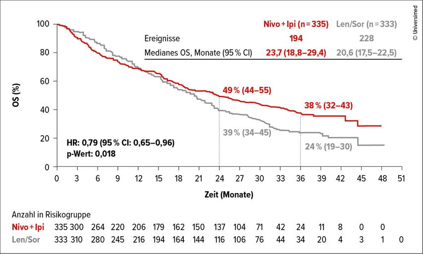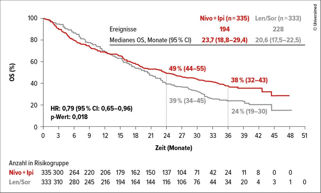 Insgesamt wurden 668 nicht vorbehandelte Patient:innen eingeschlossen, als primärer Studienendpunkt wurde das OS gewählt. Nach vier Zyklen der Kombinationstherapie wurde Nivolumab für maximal zwei Jahre und der Tyrosinkinase-Inhibitor bis Tumorprogress gegeben. Mit einer medianen Nachbeobachtungszeit von 35,2 Monaten lag das mediane OS bei 23,7 Monaten im Immuntherapie-Arm vs. 20,6 Monate im TKI-Arm.