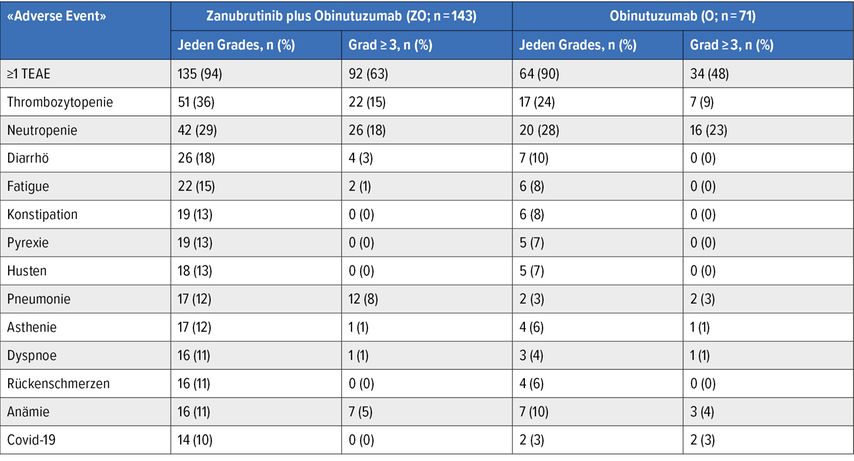 Die Nebenwirkungen der ZO-Kombinationstherapie waren beherrschbar und entsprachen dem zu erwartenden Sicherheitsprofil der einzelnen Medikamente. Zu den häufigsten Nebenwirkungen bei ZO gehörten Thrombozytopenie, Neutropenie, Durchfall und Müdigkeit. Schwere Nebenwirkungen (Grad ≥3) traten bei 63% der Patient:innen in der ZO-Gruppe und bei 48% in der O-Gruppe auf (Tab. 1). Infektionen waren im Kombinationsarm numerisch höher als im O-Monotherapie-Arm.