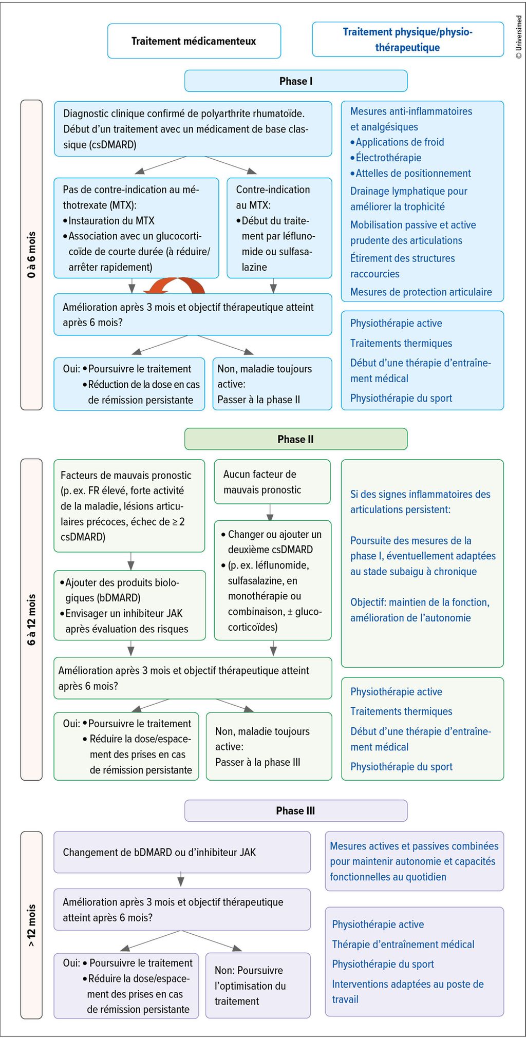 Fig. 1: Algorithme thérapeutique de la polyarthrite rhumatoïde: médicamenteux (selon Smolen JS et al. 2023)2 et physique/physiothérapeutique
