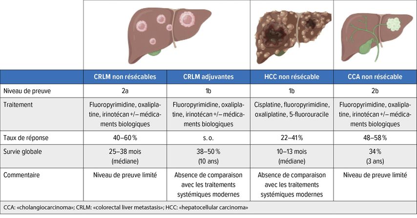 D’autres analyses de sous-groupes d’études non randomisées ont montré un bénéfice principalement sous floxuridine (HR: 0,76; IC à 95%: 0,62–0,94) et sous chimiothérapie intra-artérielle en combinaison avec un traitement systémique adjuvant (HR: 0,75; IC à 95%: 0,59–0,90). Une fois de plus, l’une des principales limites des études incluses est l’hétérogénéité en termes de charge tumorale, d’évaluation de la réponse et de résécabilité. Les traitements systémiques combinent principalement le 5-FU, l’oxaliplatine et l’irinotécan, mais plusieurs nouveaux médicaments biologiques peuvent être ajoutés. Les principes actifs modernes administrés par voie intra-artérielle permettent d’augmenter les taux de réponse. La possibilité d’initier une chimiothérapie intra-artérielle chez les patient·es dont la maladie progresse sous traitement systémique, même après plusieurs lignes de traitement, constitue une extension prometteuse des options thérapeutiques pour une maladie avancée difficile à traiter.