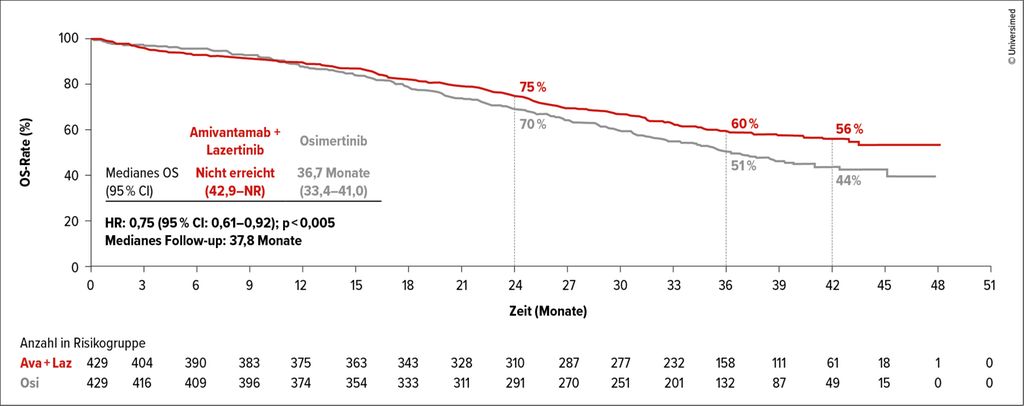 Nach einem medianen Follow-up von 37,8 Monaten war das mediane OS im AMI+LAZ-Arm noch nicht erreicht (95% CI: 42,9 bis nicht erreicht), während es unter OSI 36,7 Monate betrug (Abb. 1). Nach drei Jahren lebten noch 60% der Patient:innen im Kombinationsarm gegenüber 51% unter OSI. Modellbasierte Extrapolationen deuten auf einen potenziellen Überlebensvorteil von über einem Jahr (!) hin. Zusätzlich zeigte sich ein Vorteil beim Überleben ohne intrakranielle Progression (PFS). AMI+LAZ positioniert sich damit als neuer Therapiestandard für Patient:innen mit EGFRm NSCLC in der Erstlinie.