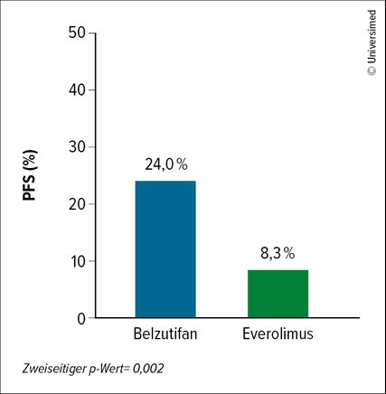 Um die Situation zu verbessern, sollten Substanzen mit einem neuen Wirkmechanismus untersucht werden. Eine vielversprechende Substanz ist der oral verfügbare HIF-2α-I Belzutifan, der zudem auch ein gutes Sicherheitsprofil aufweist: In der offenen Phase-III-Studie LITESPARK-005 wurde Belzutifan mit EVE an 374 ccRCC-Patient:innen mit vorangegangener IO und antiangiogenetischer Therapie verglichen. Der koprimäre Endpunkt setzte sich aus PFS und OS zusammen. In der ersten Interimsanalyse waren nach 18 Monaten unter Belzutifan vs. EVE 24,0 vs. 8,3% der Patient:innen progressionsfrei und am Leben. Damit war Belzutifan der Vergleichssubstanz signifikant überlegen (p=0,002; Abb.1). Das OS war in der zweiten Interimsanalyse (medianes Follow-up: 25,7 Monate) mit 21,4 vs. 18,1 Monate in nicht signifikantem Ausmass unter Belzutifan länger (p=0,2). Die finalen Ergebnisse sind noch ausständig.18