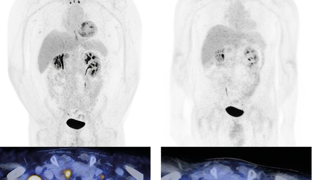 Abb. 1: Urothelkarzinom der Harnblase (initial cT3 cN3 cM0) mit metachron aufgetretener lymphogener Metastasierung. Staging mittels Computertomografie (PET-CT) mit Diagnose der lymphogenen Metastasierung (a, links). Erstes Restaging zwei Monate nach Therapiebeginn mit EV+P (b, rechts). Bildmorphologisch zeigt sich eine Komplettremission. Der Patient befindet sich weiterhin in anhaltender Remission. Bilder und Patient USZ Zürich