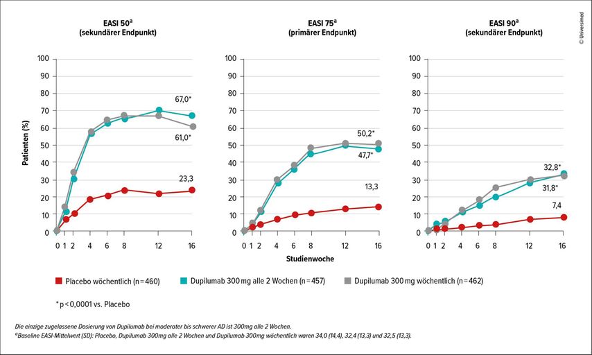 Abb. 1:EASI-Ansprechen unter Dupilumab – gepoolte Studienanalyse über 16 Wochen (modifiziert nach Ferrándiz C et al. 2017)1