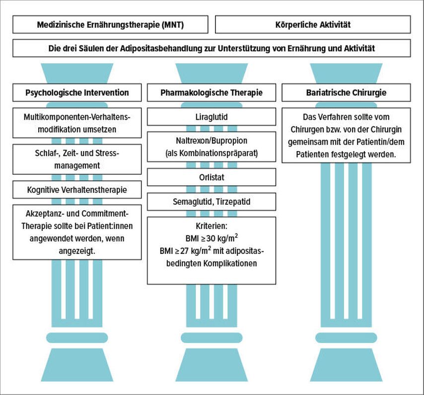 Grundsätzlich erfordert Adipositas eine Langzeitbehandlung, wie es auch bei anderen chronischen Erkrankungen der Fall ist. Die Auswahl und Ziele der Behandlung sollten patient:innenzentriert festgelegt werden und neben dem Gewicht funktionelle, metabolische und psychosoziale Endpunkte umfassen.16