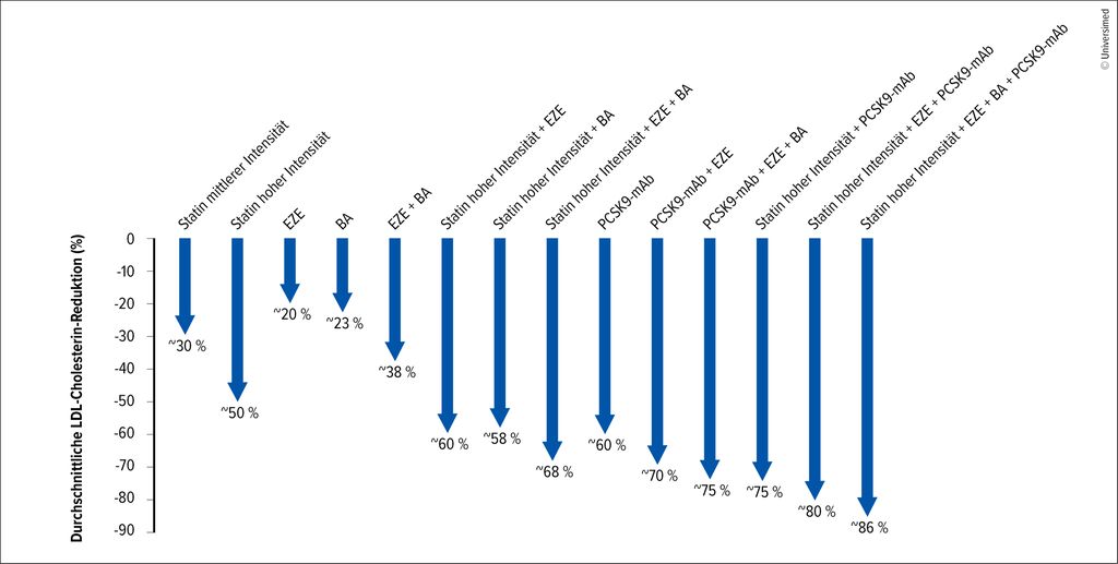 Evidenzbasierte, stufenweise Therapiekonzepte mit Lebensstilmodifikation, Statinen plus frühzeitiger Kombinationstherapie (Ezetimib, Bempedoinsäure, PCSK9) ermöglichen LDL-C-Senkungen bis zu 85%.