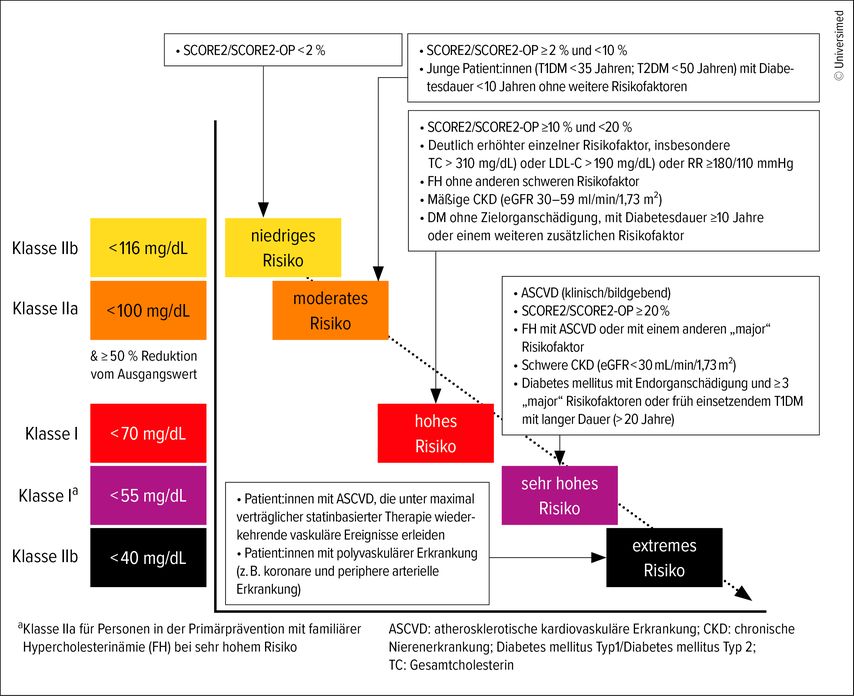 Das zentrale therapeutische Ziel bleibt das LDL-C und Therapieziele werden anhand des individuellen Risikos der Patient:innen bestimmt. Dafür werden eine ausführliche Anamnese, das vollständige Lipidprofil sowie die Bestimmung gemäß SCORE2, SCORE2-OP bzw. SCORE2-Diabetes herangezogen. Im Endeffekt ergeben sich folgende fünf Risikogruppen: niedriges, moderates, hohes, sehr hohes und seit 2025 extrem hohes Risiko (Abb.1). Ab einer hohen Risikoeinschätzung ist weiters zu beachten, dass eine LDL-C-Reduktion um mindestens 50% vom Ausgangswert erreicht werden soll. Die Zielwerte für Non-HDL-C ergeben sich durch die entsprechenden LDL-C-Zielwerte plus 30mg/dl.3,4 Der „Lp(a) Clinical Guidance“-Rechner veranschaulicht die Wahrscheinlichkeit eines kardiovaskulären Events bis zum 80. Lebensjahr. Hierbei können die Effekte eines erhöhten Lp(a) sowie die Auswirkung einer LDL-C-Senkung miteinberechnet werden.