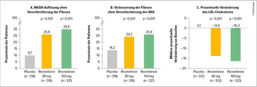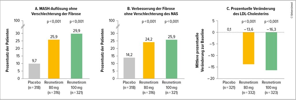 Abb. 1: Ergebnisse der Phase-II-Studie zu Resmetirom bei MASH. A: Senkung des NAFLD-Activity-Scores (NAS) um mindestens zwei Punkte ohne Verschlechterung der Fibrose zu Woche 52. B: Reduktion der Fibrose ohne Verschlechterung des NAS zu Woche 52. C: prozentuelle Veränderung des LDL-Cholesterins zu Woche 24 (modifiziert nach Harrison SA et al. 2024)7