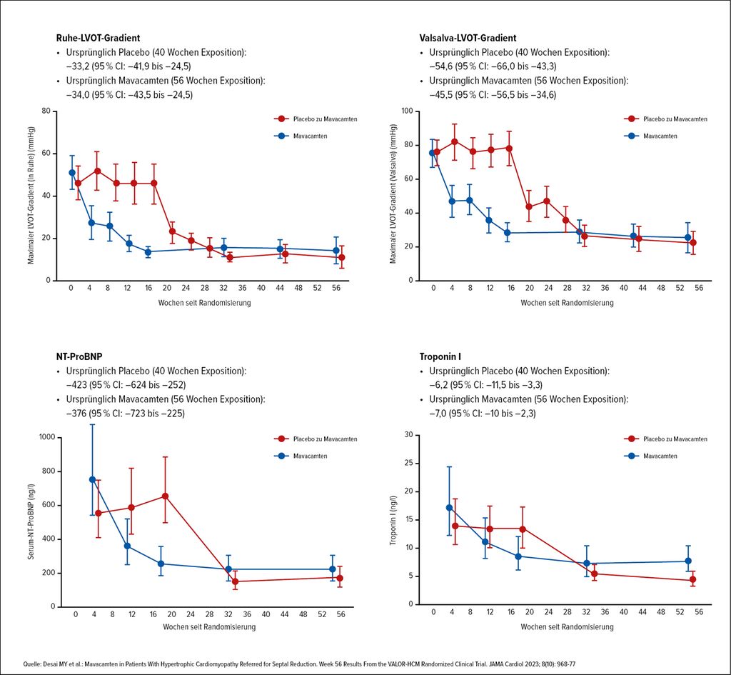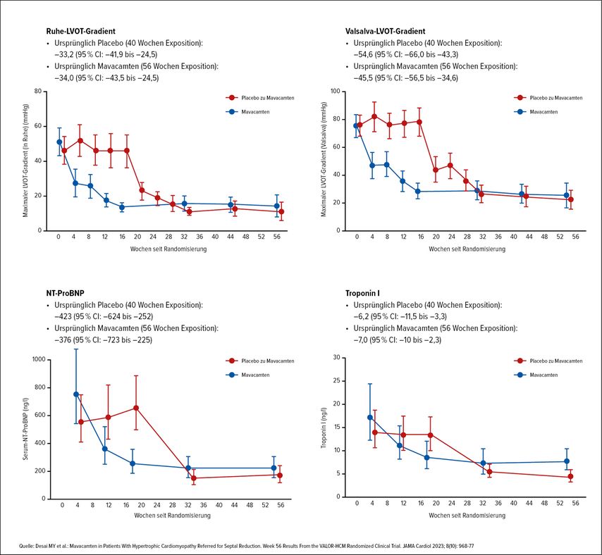 Im Langzeit-Follow-up nach 128 Wochen erfüllten schließlich nur 15,7% der gesamten Studienpopulation (initial auf Mavacamten eingestellte sowie ab Woche 16 von Placebo auf Mavacamten umgestellte Patient:innen) die Kriterien für eine Septumreduktionstherapie oder entschieden sich dafür.6 Mittlerweile sind aus den Studien EXPLORER-HCM und VALOR-HCM Daten über bis zu 180 Wochen publiziert, die anhaltende Reduktionen des LVOT-Gradienten und des NT-proBNP zeigen.7