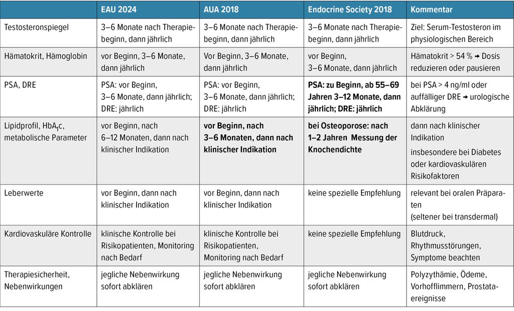 Regelmäßige Kontrollen von Testosteron, Hämatokrit, PSA, Lipidprofil und HbA1c sind wichtig; Vorsicht bei Vorhofflimmern, Herzinsuffizienz und Polyzythämie; Therapiebeginn nach akutem Koronarsyndrom frühestens nach 6 Monaten.