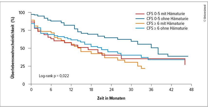 Der CSHA-CFS erwies sich in der Gesamtkohorte als Prädiktor für die 1-Jahres-Mortalität. In der univariablen Cox-Regression hatten Patient:innen mit einem CSHA-CFS ≥6 ein signifikant höheres Risiko, innerhalb eines Jahres zu versterben (Hazard-Ratio [HR]: 1,6; 95% CI: 1,1–2,5; p=0,03). Für die Subgruppe der Patient:innen mit Makrohämaturie (46/136 Todesfälle, 34,3%) war der CSHA-CFS hingegen kein signifikanter Prädiktor für die 1-Jahres-Mortalität (HR: 0,9; 95%CI: 0,5–1,6; p=0,7).
