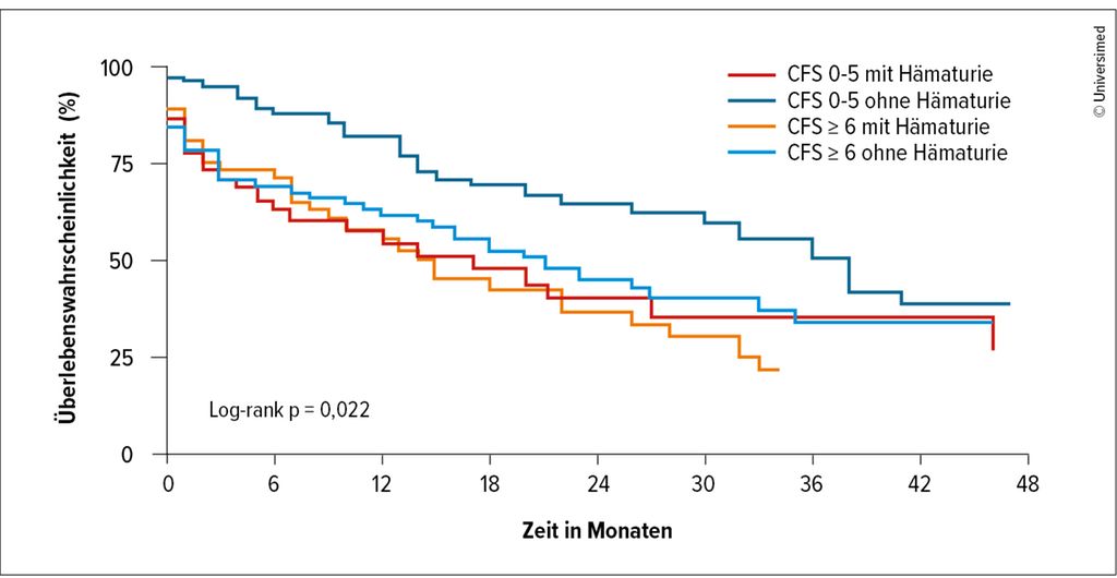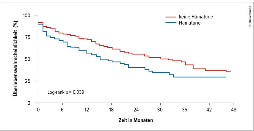 Zudem wurden die Wiederaufnahmerate und das Überleben von Patient:innen über 90 Jahre mit und ohne Makrohämaturie verglichen. Bei einem medianen Follow-up von 20 Monaten (CI 95%: 16–27) lag die Wiederaufnahmerate in beiden Gruppen bei 54%. Patient:innen ohne Makrohämaturie hatten jedoch ein signifikant längeres Überleben (medianes Überleben: 32 Monate [CI 95%: 23–50] vs. 15 Monate [CI 95% 12–22], Abb.1). Allerdings war die Makrohämaturie in den meisten Fällen nicht die direkte Todesursache, häufig lagen kardiovaskuläre Erkrankungen zugrunde.
